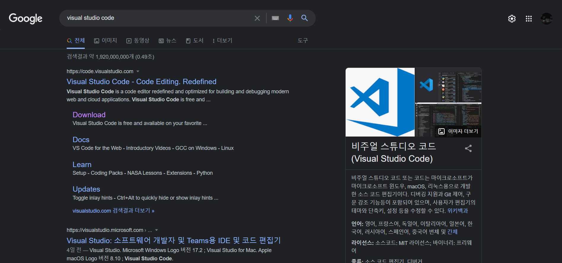 Visual Studio Code를 검색 후 다운로드 페이지로 이동한다.