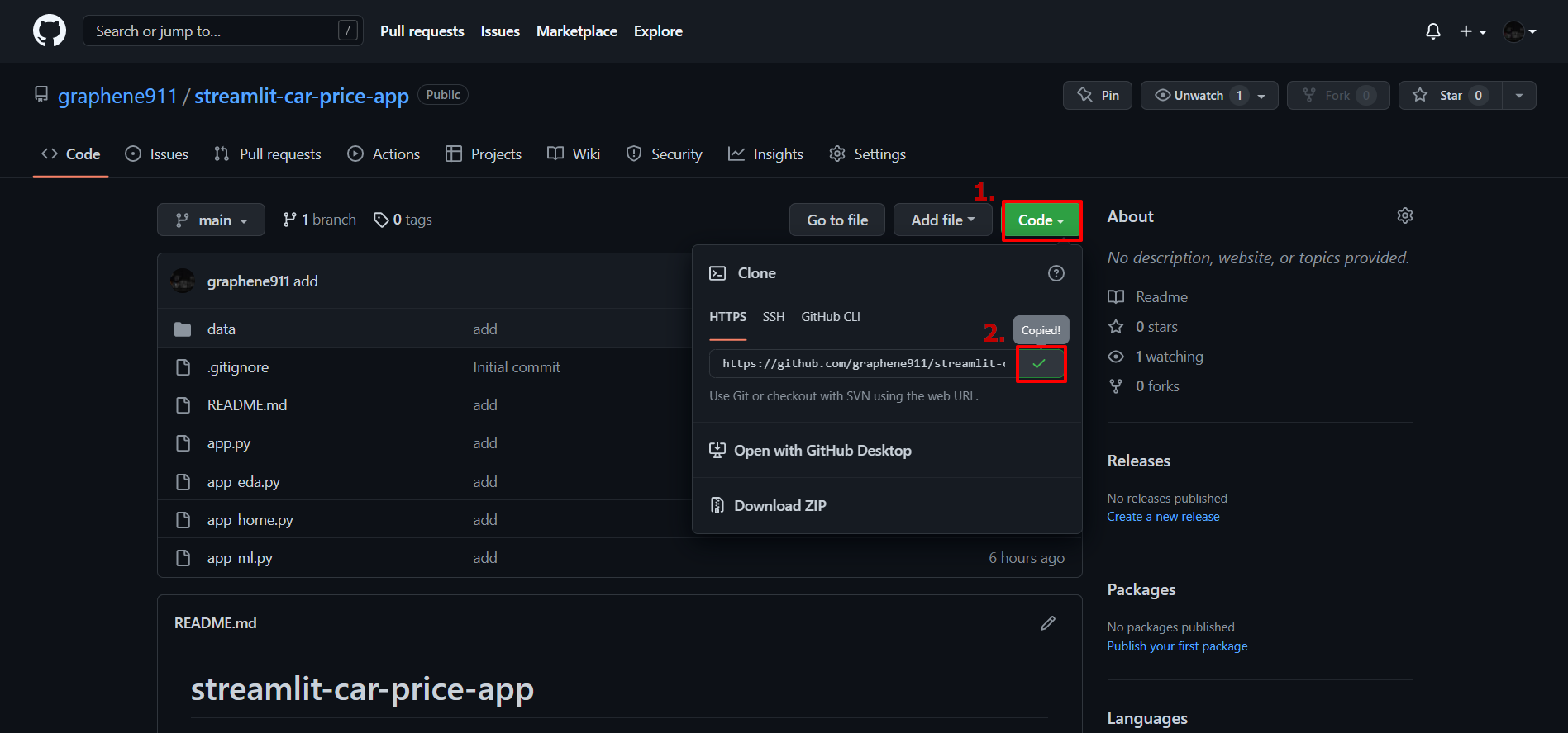 그에따라 아래 사진처럼 내가만든 레퍼지토리에서 url을 복사한다.