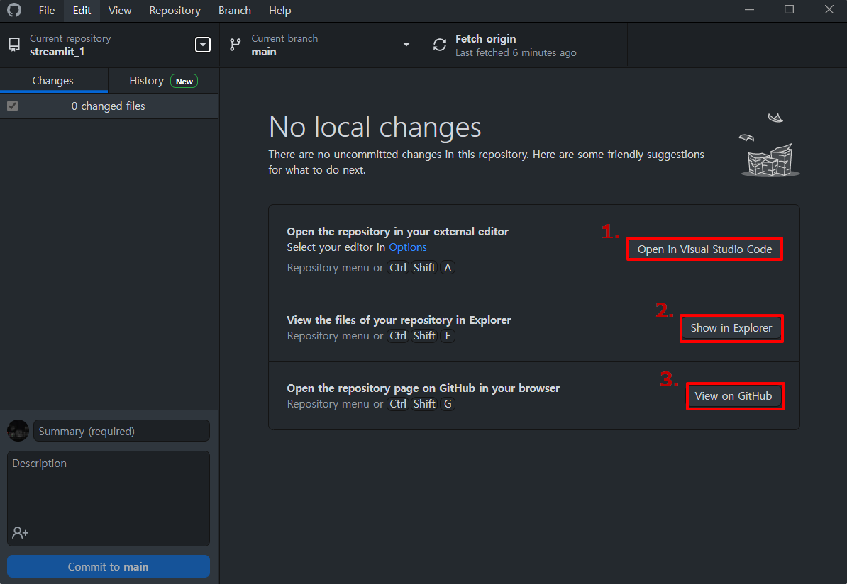 1. Open in Visual Studio Code : 비주얼 스튜디오에서 내 가 작업할 레퍼지토리를 열고 작업할 수 있다.