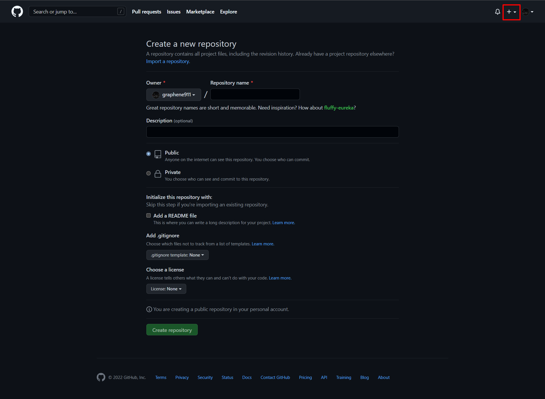 우측 상단 + 버튼을 클릭후 New Repository를 선택하면 아래와 같은 화면으로 이동된다.