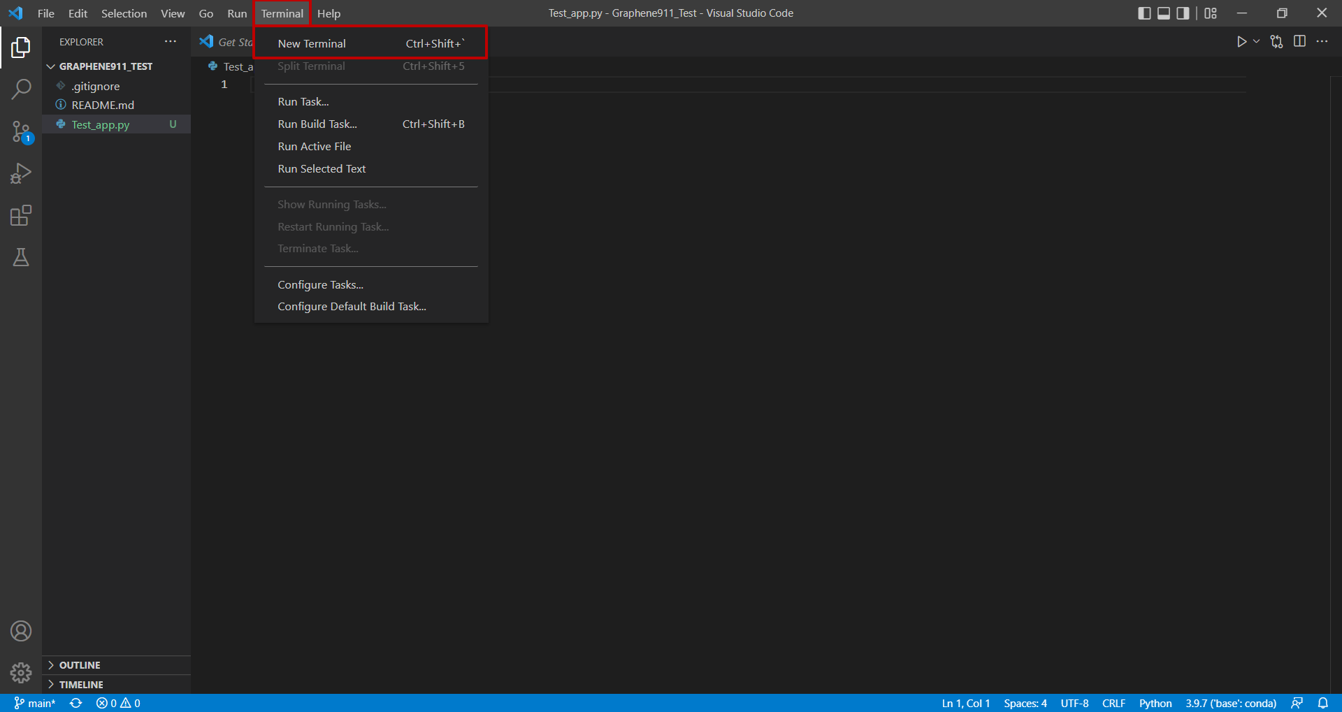 터미널 탭에서 뉴 터미널을 선택해 터미널창을 연다.