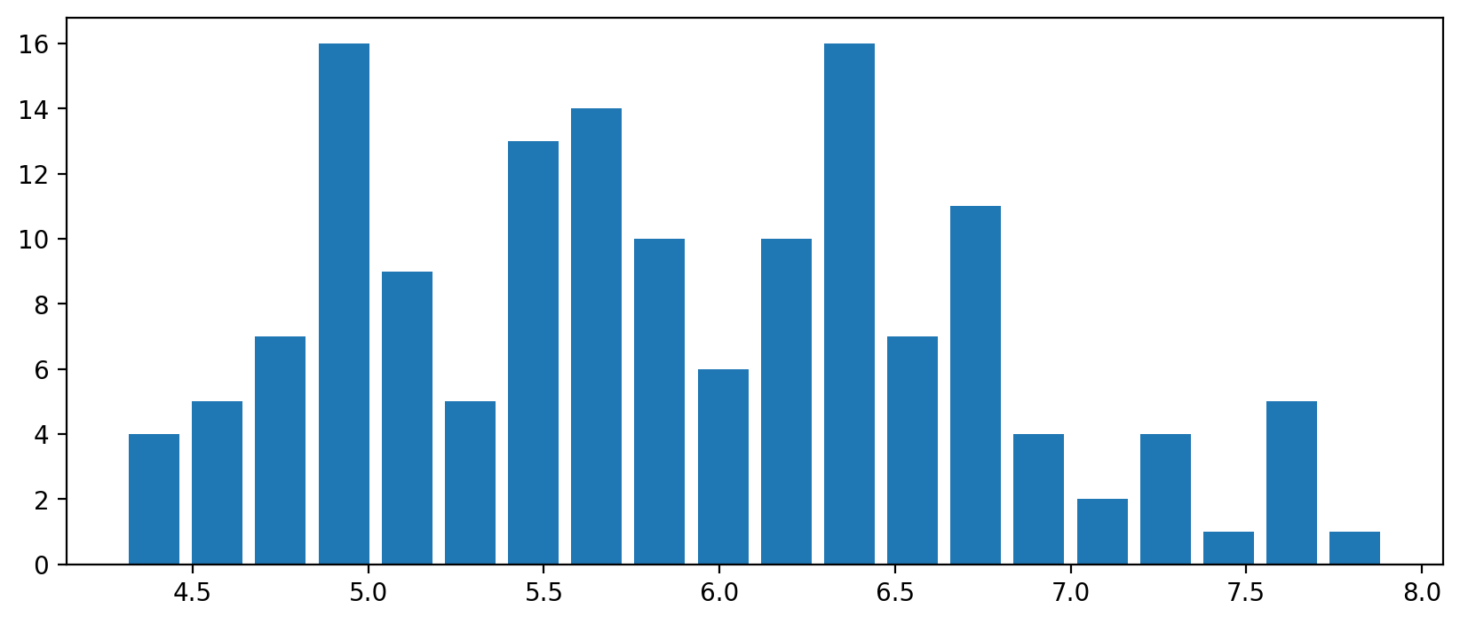 plt.hist(data=df, x='sepal_length', bins=20, rwidth=0.8)