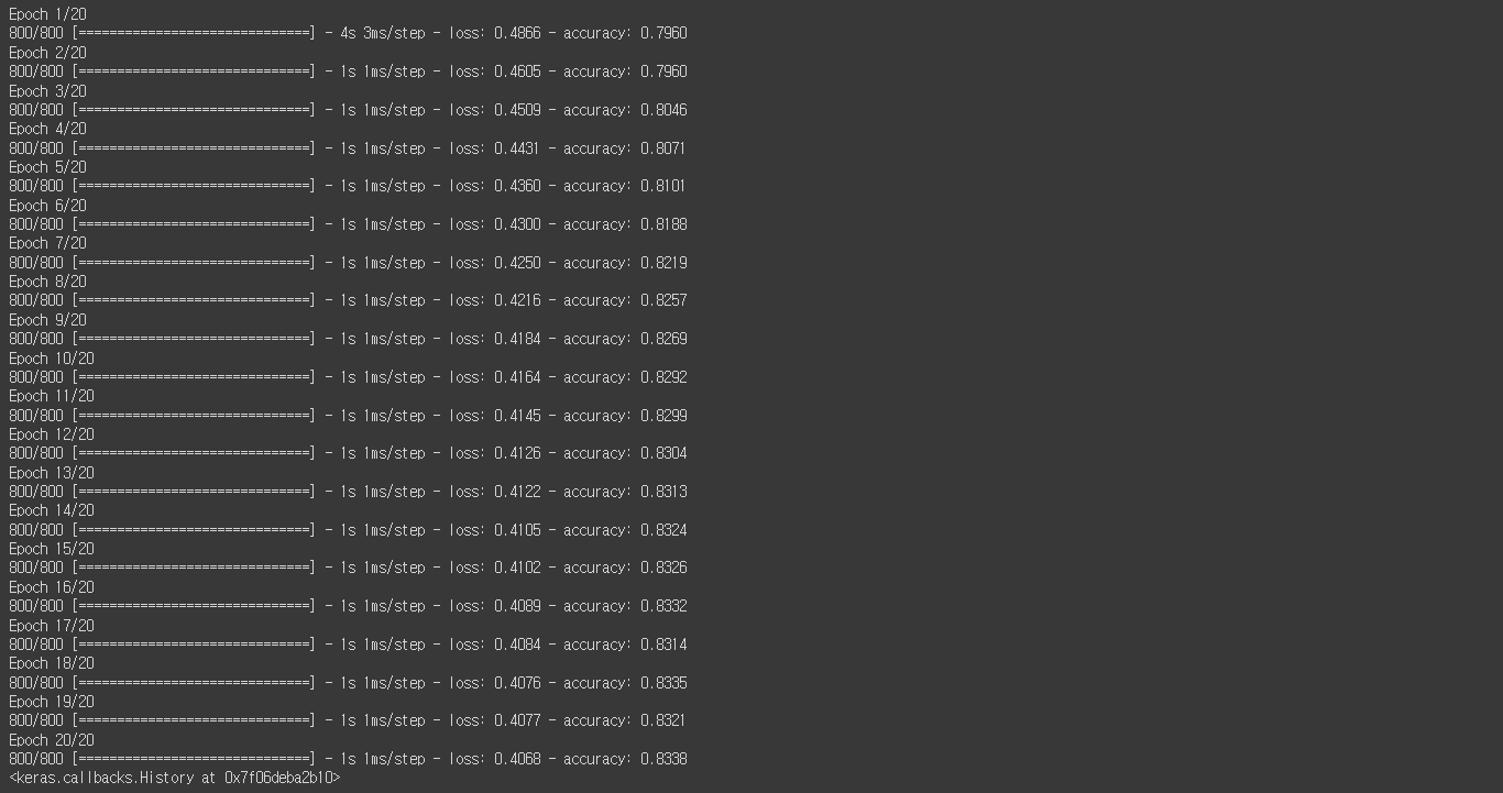 model.fit(X_train, y_train, epochs = 20, batch_size = 10)