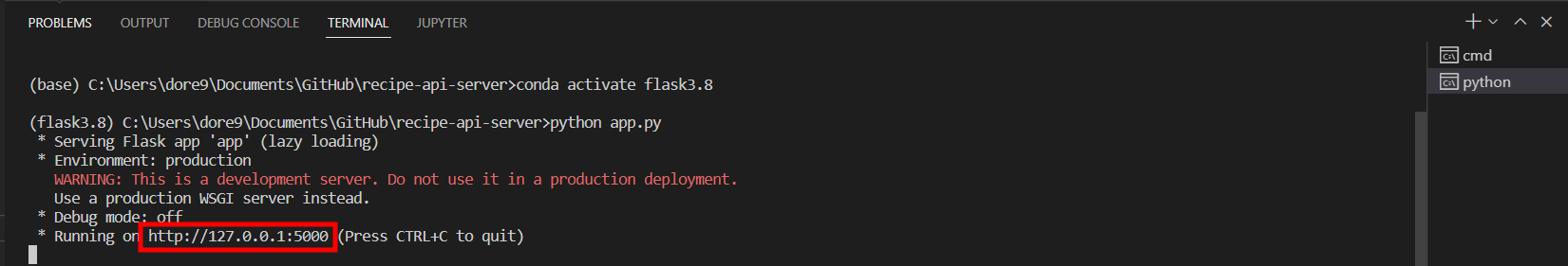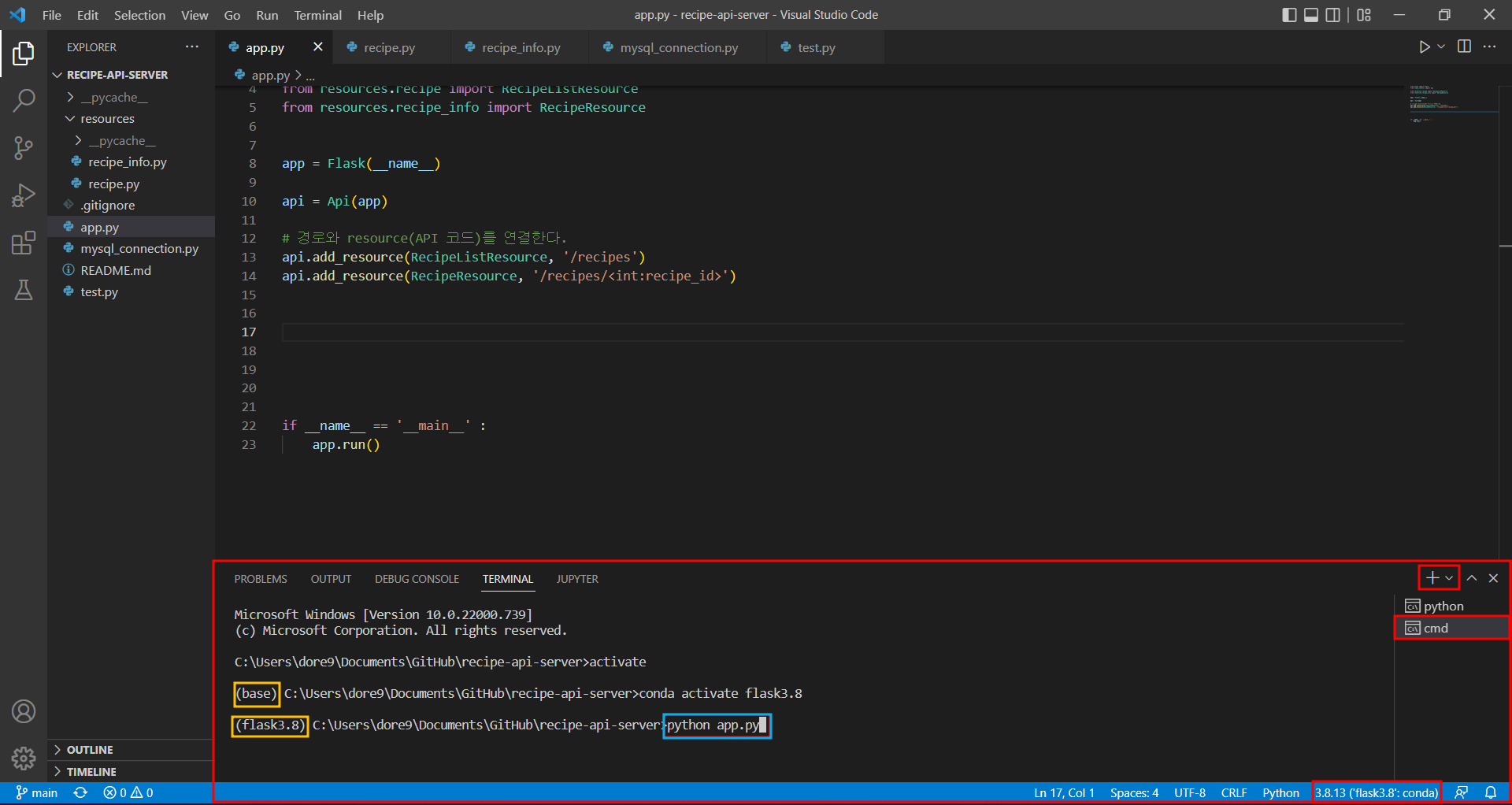 6. 내가 설정한 가상환경에 접속 후 터미널에 python app.py를 작성해 실행해준다.