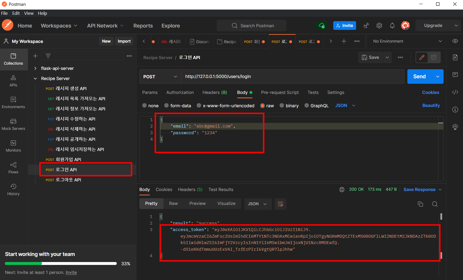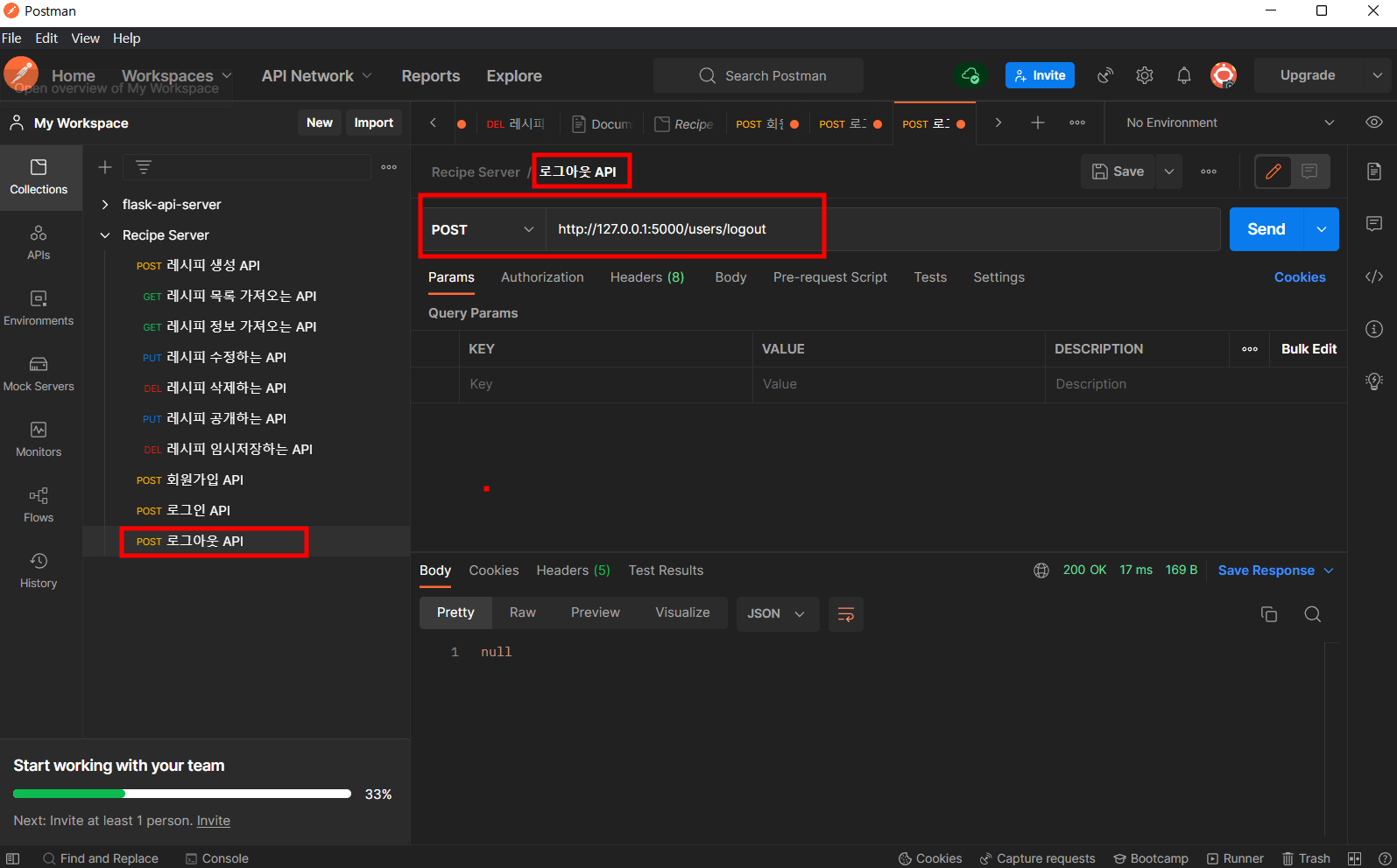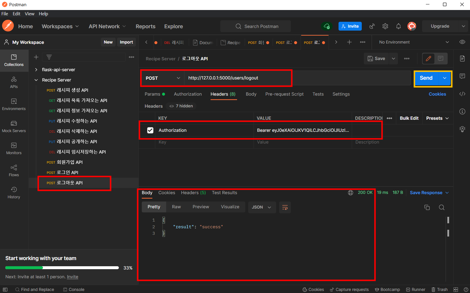 LOGOUT API Headers에 토큰 입력 후 테스트