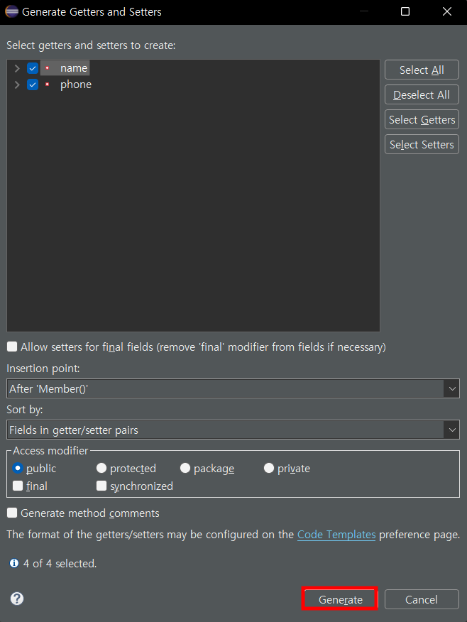 여러개의 Getter와 Setter를 쉽게 생성하는 방법