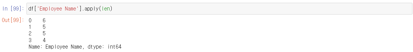 Employee Name컬럼의 데이터를 하나씩 가져와서 , len 함수에 적용하라