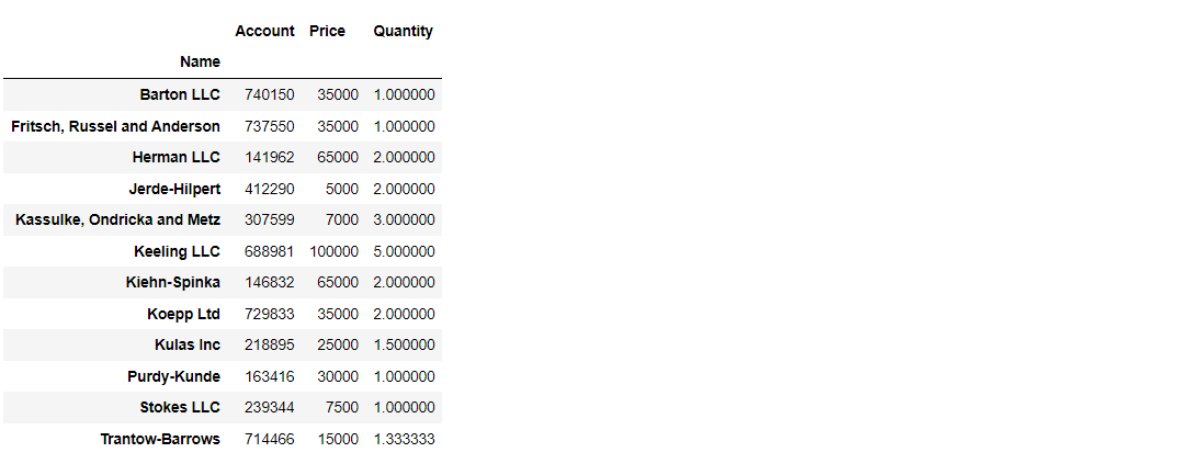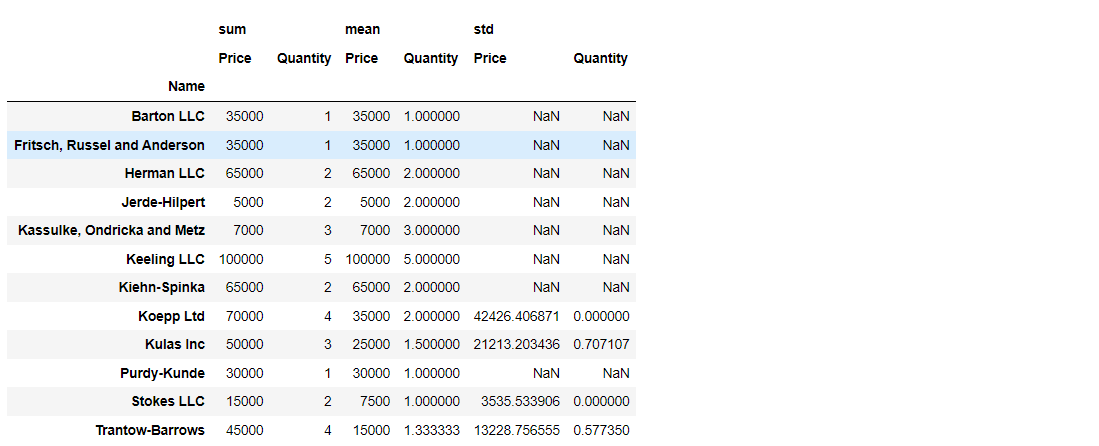 pd.pivot_table(df, index=['Name'], values=['Price','Quantity'], aggfunc=[np.sum,np.mean,np.std])