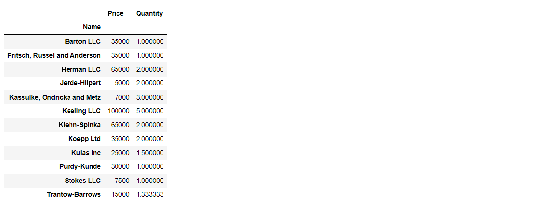 pd.pivot_table(df,index=['Name'], values=['Price', 'Quantity'])