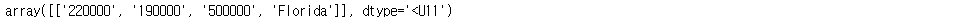 new_data = np.array( [ 220000, 190000, 500000, 'Florida' ] )