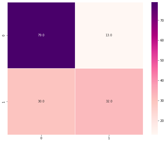 sb.heatmap(data= cm , cmap = 'RdPu', annot = True, fmt = '.1f', linewidths=0.5)