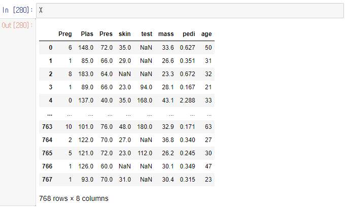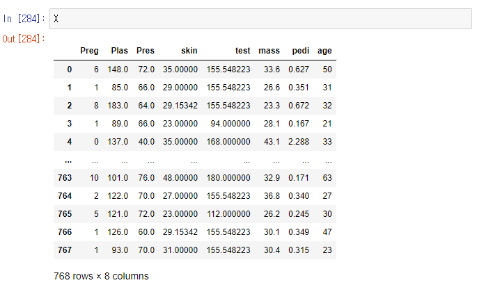 X.loc[ : , 'Plas' : 'mass'] = X.loc[ : , 'Plas' : 'mass'].replace( 0, np.nan)