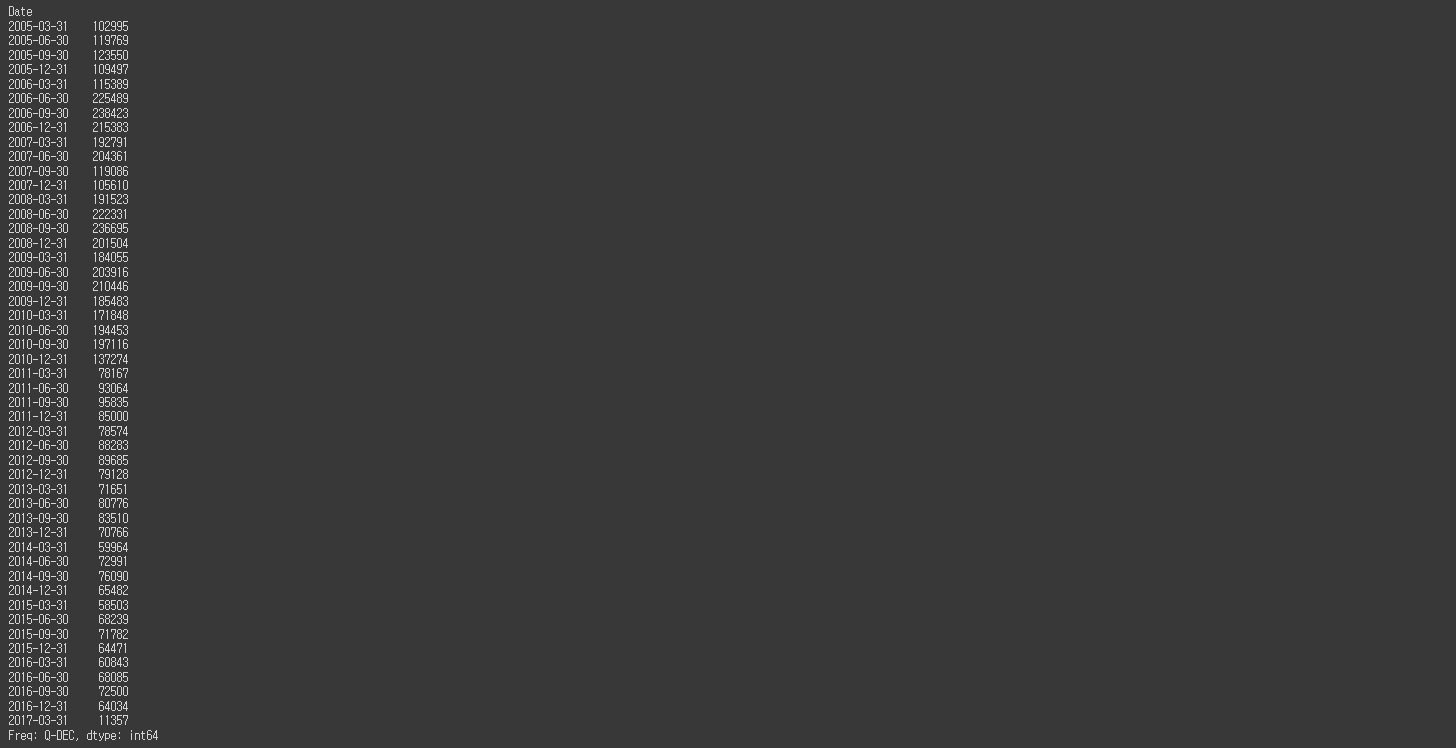 df_quarter = df.resample('Q').size()