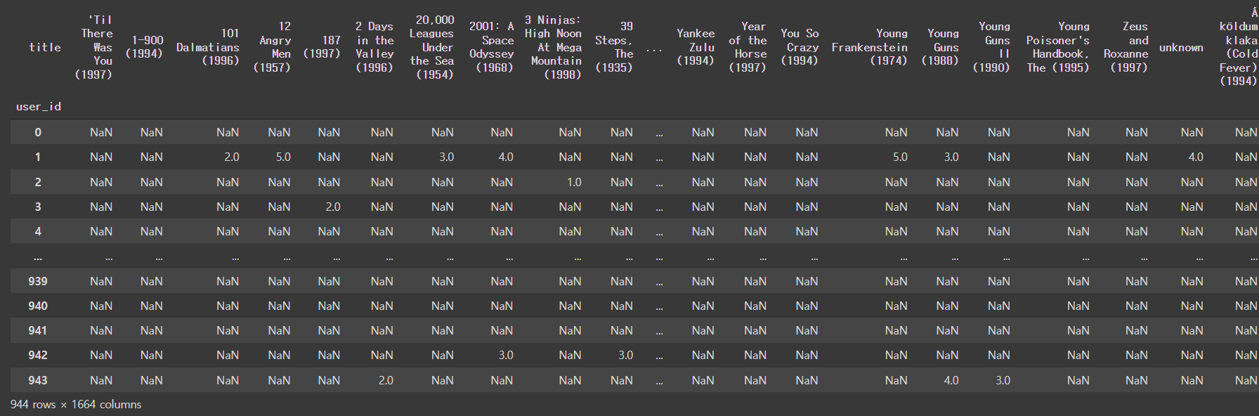 df = movies_rating_df.pivot_table(values= 'rating', index= 'user_id', columns='title', aggfunc='mean')