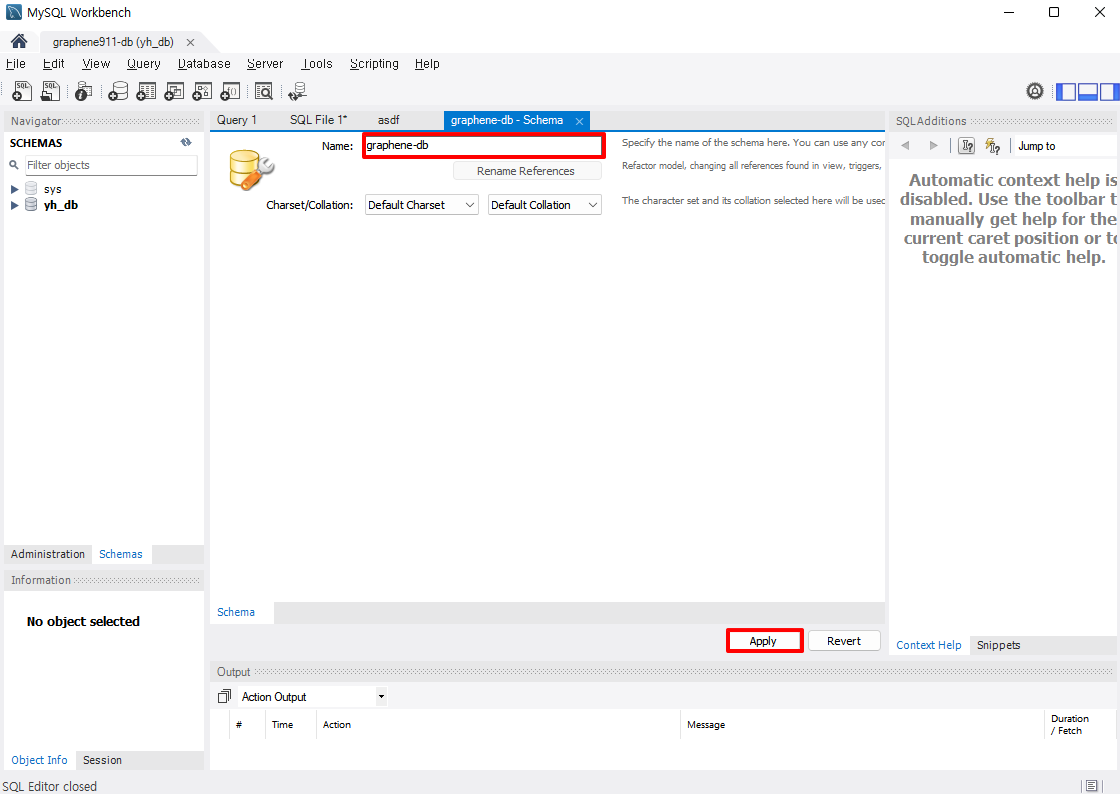 3. ' Schema '의 이름을 설정한 후 Apply버튼을 누른다.