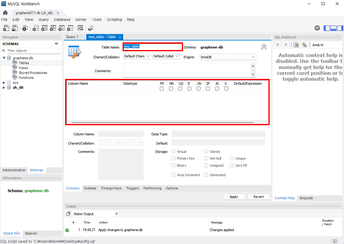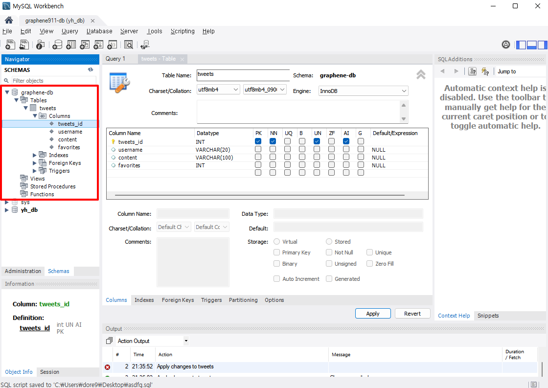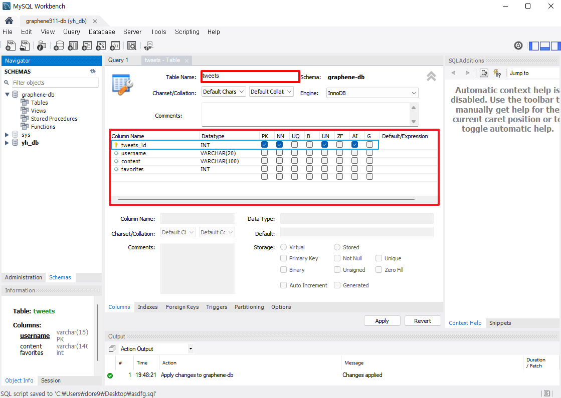 12. 생성된 테이블 및 컬럼은 좌측 Schema에서 확인 할 수 있다.