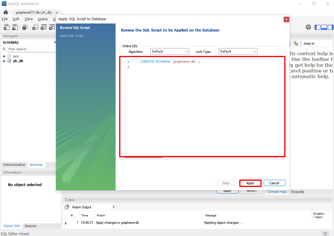 4. Apply 버튼을 누르면 창이 하나 생성되는데, 이것은 Schema를 생성하는 코드를 보여준다.