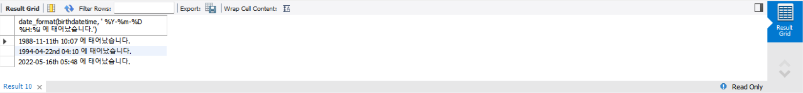 select date_format(birthdatetime, ' %Y-%m-%D %H:%i 에 태어났습니다.')