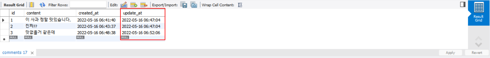 위 예시 이미지와 같이 update_at이라는 컬럼에