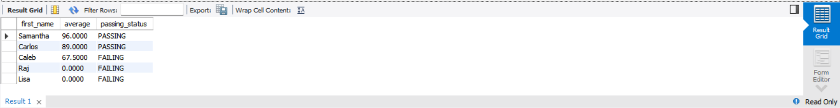 select first_name, avg( ifnull(grade, 0)) as average, if(avg(grade) >= 80, 'PASSING', 'FAILING') as passing_status
