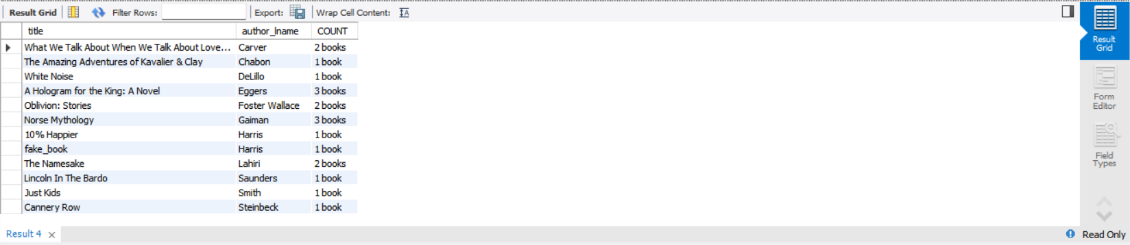 select title, author_lname, if(count(*) = 1, concat(count(*),' book'), concat(count(*),' books')) as COUNT