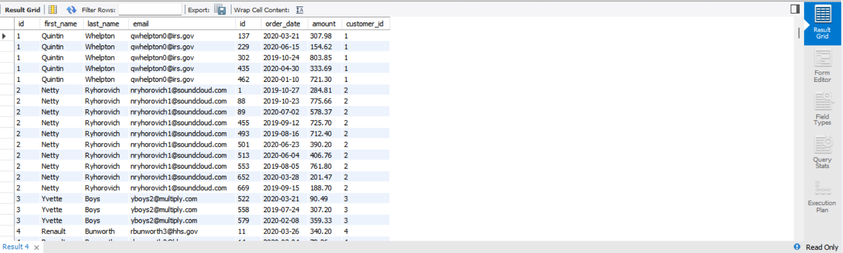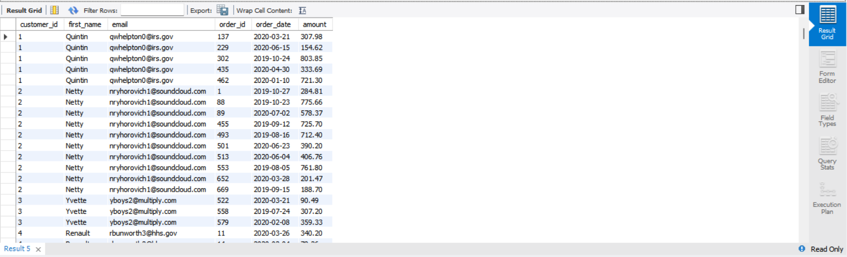 select c.id as customer_id , c.first_name, c.email, o.id as order_id, o.order_date, o.amount